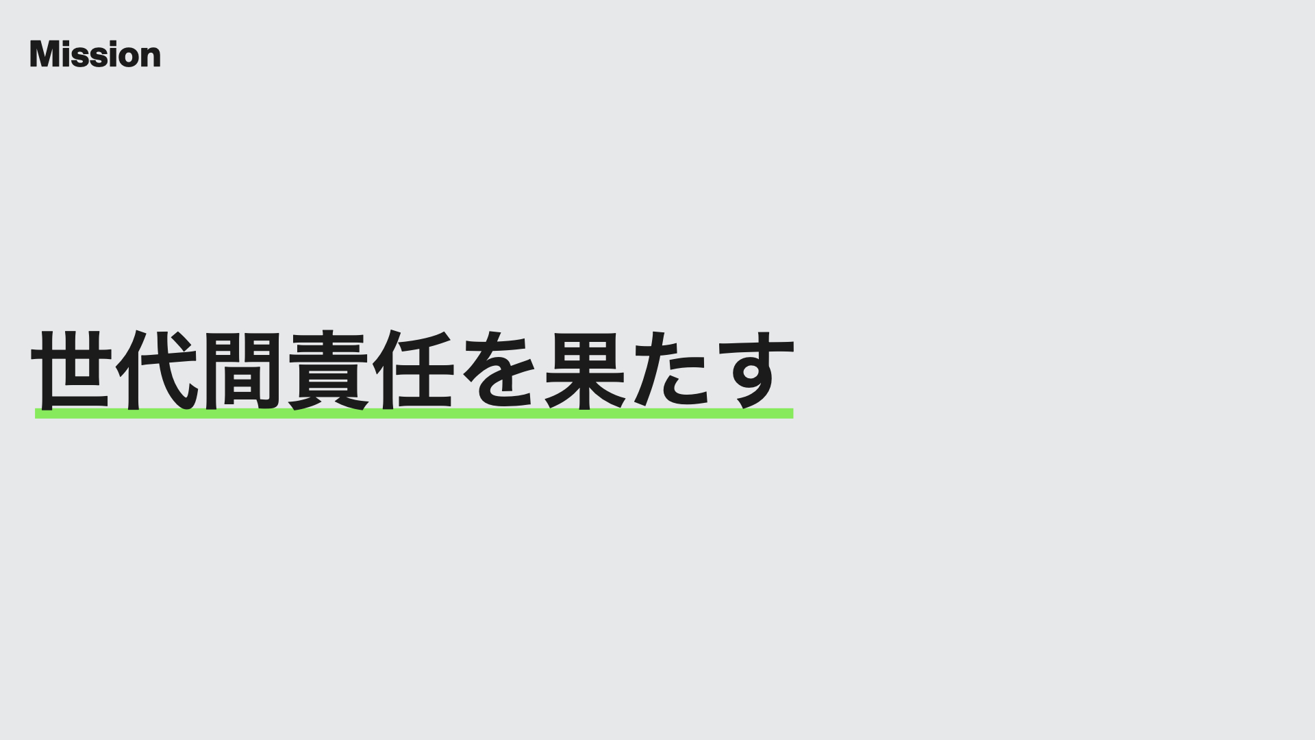 気候変動は現代における重要な課題です。しかし私たちは今の心地よさを優先し、次世代に解決を任せている状態です。この社会の仕組みに変革を起こし、世代間責任を果たすこと。これが私たちのミッションです。